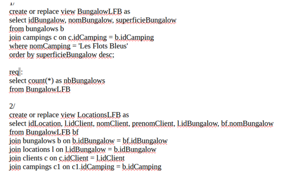 Trace 2 : Un ensemble de requêtes permettant de créer des vues pour ainsi montrer les informations que l’on veut pour une question de sécurité. Dans la première requête, j’ai créé une vue “BungalowLFB” qui nous permettait d’avoir seulement les informations des bungalows qui se trouvent dans le camping “Les Flots Bleus”. Dans la deuxième requête, la vue “LocationsLFB” contient les locations de tous les clients ainsi que le bungalow dans lequel ils se trouvent. (AC1)