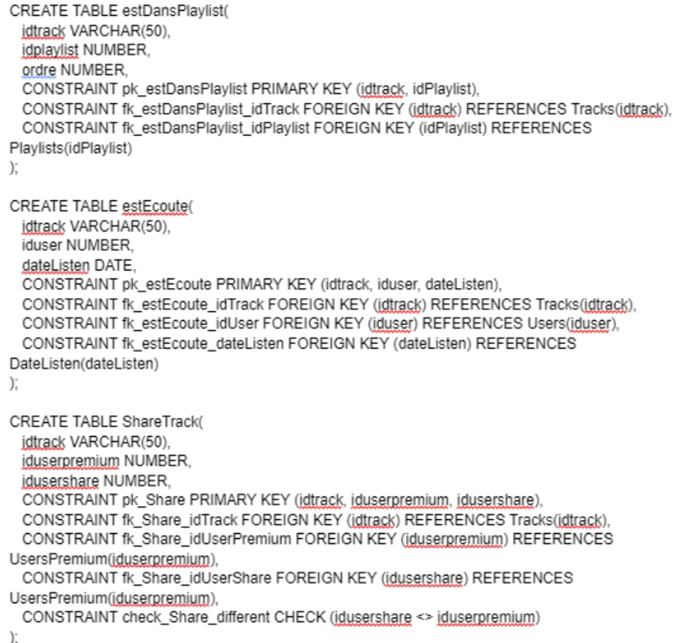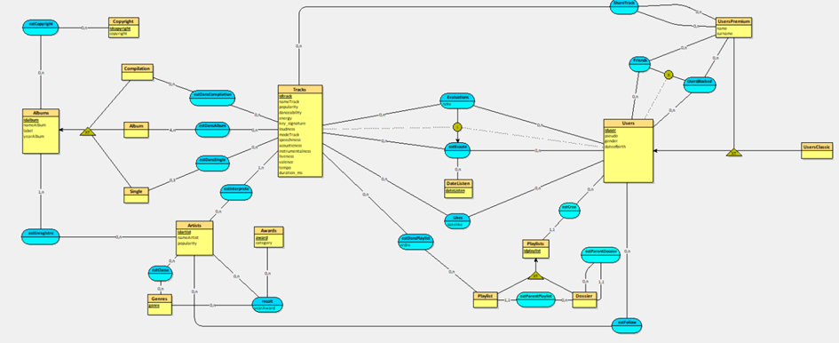 Au second semestre, nous avons eu un “cahier des charges” sur une base de données Spotify (avec des morceaux, playlists, albums, utilisateurs...) où se trouvait l’explication de chaque table, ce qu’elle contenait, et les différents paramètres. Nous avons pour cela réalisé un diagramme entité-association pour représenter la structure de la BD, nous avons ensuite réalisé un schéma relationnel, créé le script de création des tables ainsi que l’insertion des données dans les différentes tables.