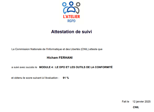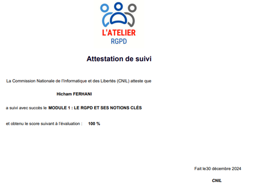 Nous avons, au 3ème semestre, réalisé l’atelier RGPD, qui sert à sensibiliser et former les participants à la protection des données personnelles dans le cadre légal européen. J’ai de ce fait réalisé 4 ateliers, et obtenu pour chacune la certification de réussite.
