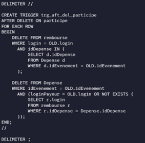 Trace 6 : Ce trigger a été réalisé dans le but de supprimer les données de certaines tables lorsqu’un utilisateur quittait un évènement.